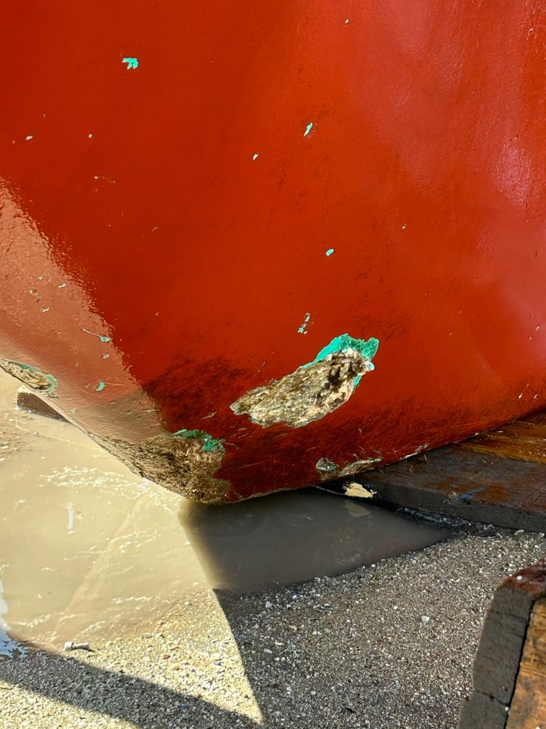 The first crane turned out to be too small, so they brought in a bigger one. The second attempt went smoothly, and soon we were settled in our land spot. The hull got cleaned and looked good, for the keel.